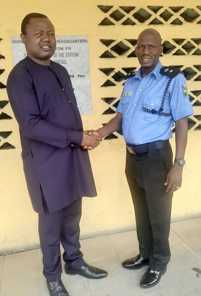Pastor Linus Ochai. Resident Pastor, Firstlove Assembly, Rumuokwuta having hand-shake with Barrister Ahmed, District Police Officer, Kala Police Station, Port Harcourt , Rivers State, Nigeria.